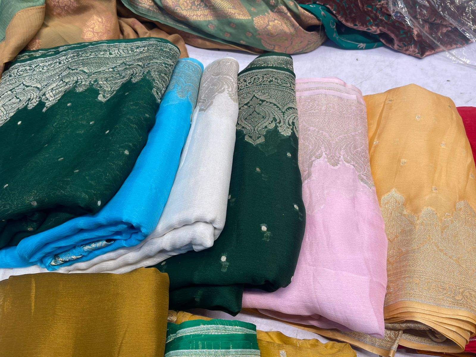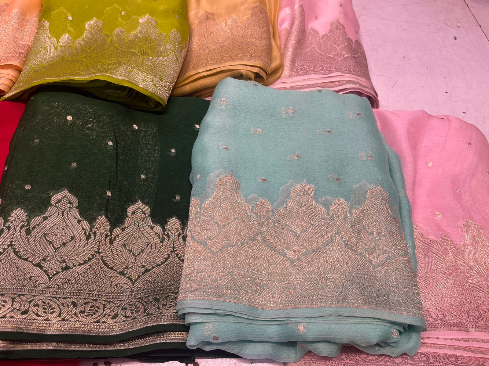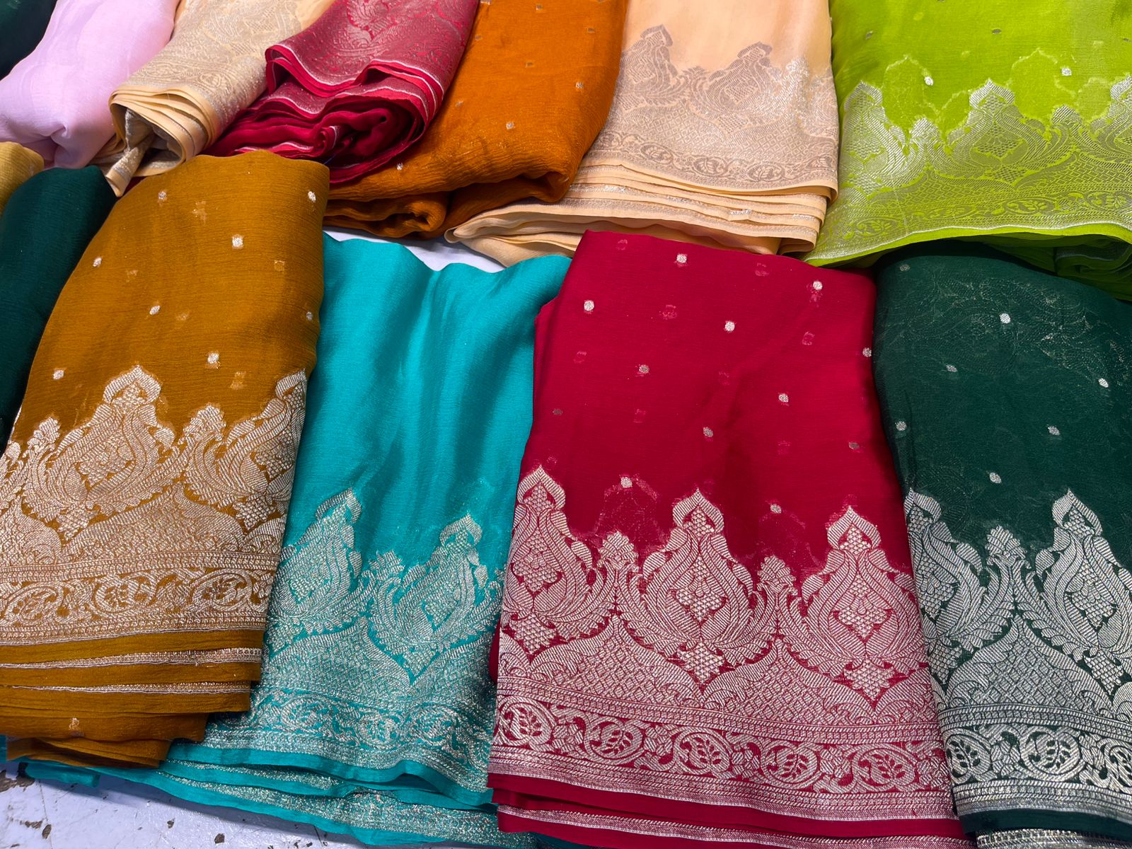Banarasi handloom sarees are a collection of exquisite traditional Indian garments. These sarees are handwoven in the city of Varanasi using fine silk threads. They feature intricate designs and motifs that are woven using gold or silver zari threads, making them a luxurious and timeless piece of clothing.
